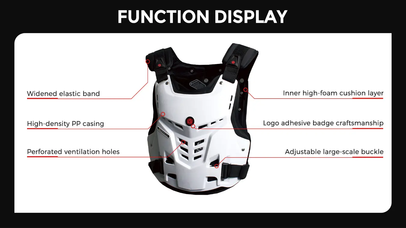 • La parte delantera del pecho y la espalda están cuidadosamente seleccionadas con capas de PP de alta densidad resistentes a los impactos, que pueden soportar el impacto y la presión frontal durante una caída, proporcionando una fuerte protección para las zonas clave.